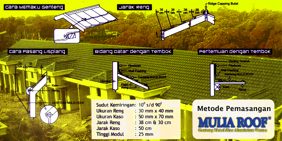 MULIA ROOF merupakan genteng metal terbaik berbahan Zinc Aluminium (55% Aluminium). Sistem pengecetan dengan teknologi tinggi sehingga warna cemerlang dan tidak pudar, anti bocor, anti karat, ringan dan efisien.